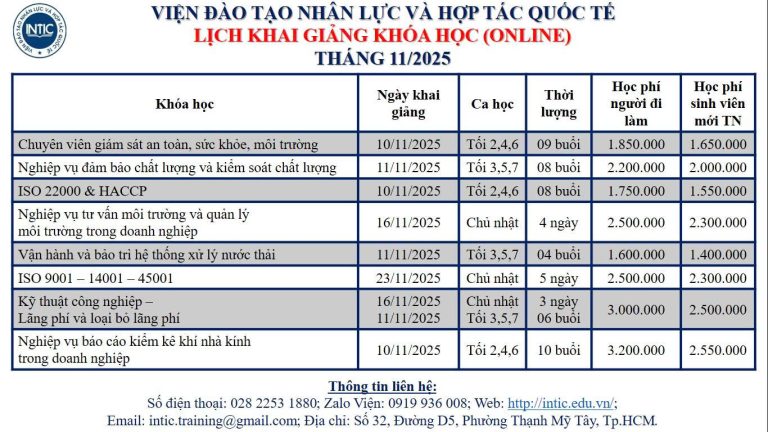LỊCH KHAI GIẢNG THÁNG 09/2025 – INTIC 1. Chuyên viên giám sát an toàn, sức khỏe, môi trường Ngày khai …