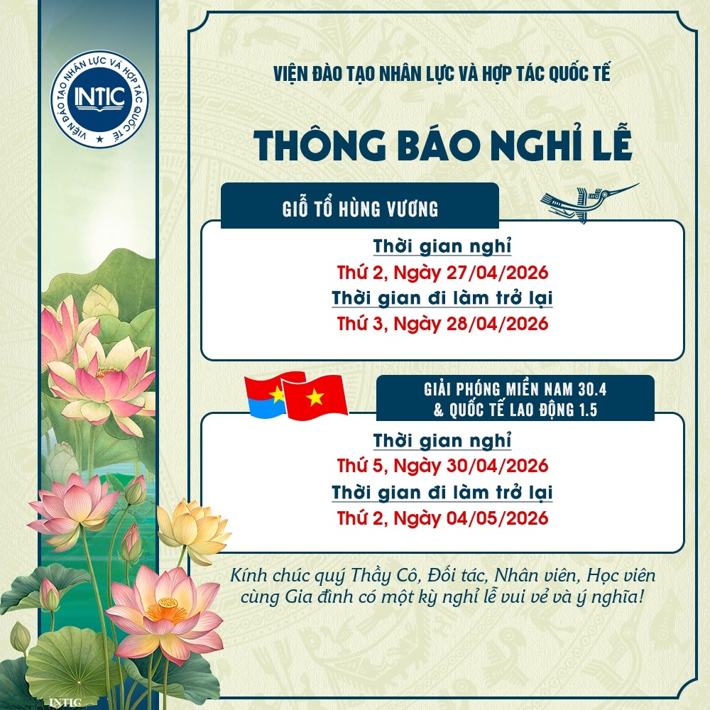 THÔNG BÁO LỊCH NGHỈ LỄ GIỖ TỔ HÙNG VƯƠNG, GIẢI PHÓNG MIỀN NAM (30/04) VÀ QUỐC TẾ LAO ĐỘNG (01/05)Bởi INTIC Vien / 23 Tháng 4, 2026